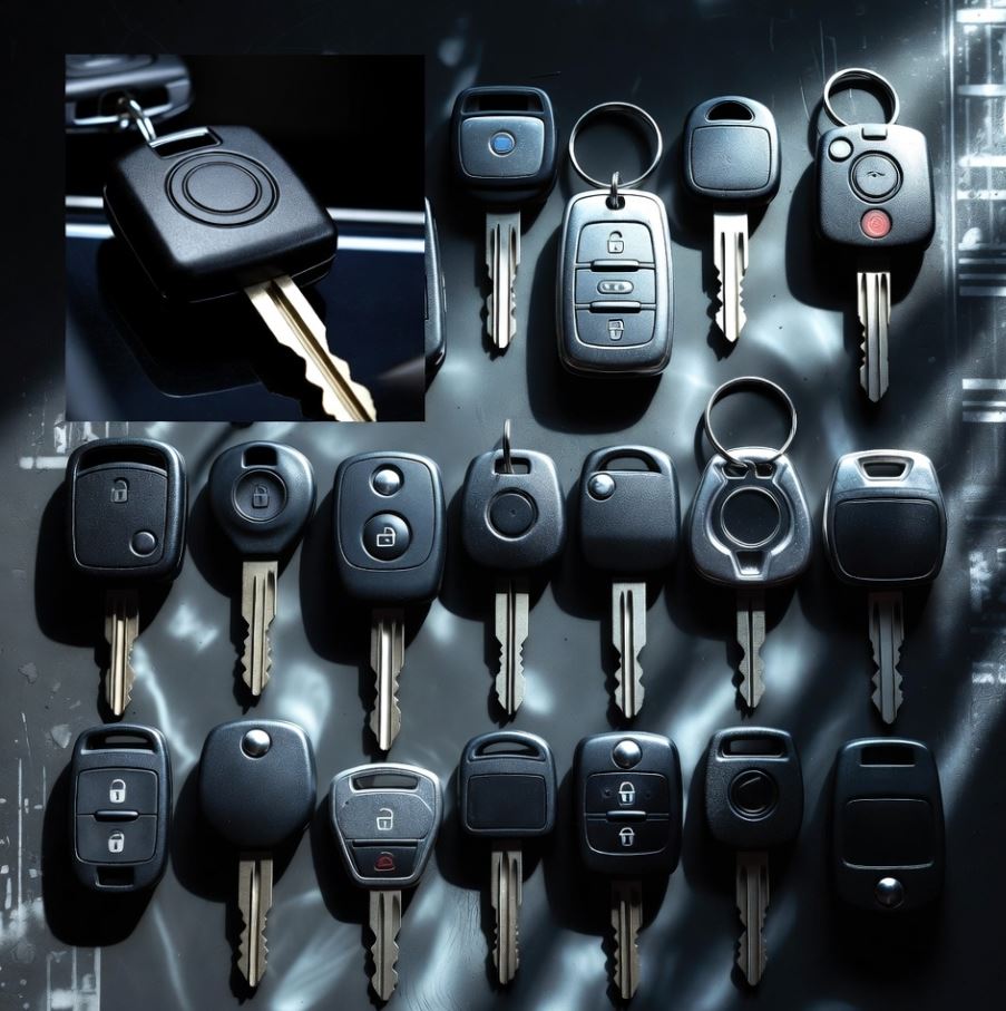 شکل ۱: نمونه‌ای از انواعریموت کیلس ایموبلایزر و کلید قفل‌ها و کلیدهای برنجی (نظیر قفل پدالی، قفل ترکیبی و کلید کلاسیک) که در خدمات کلیدسازی مورد استفاده هستند.