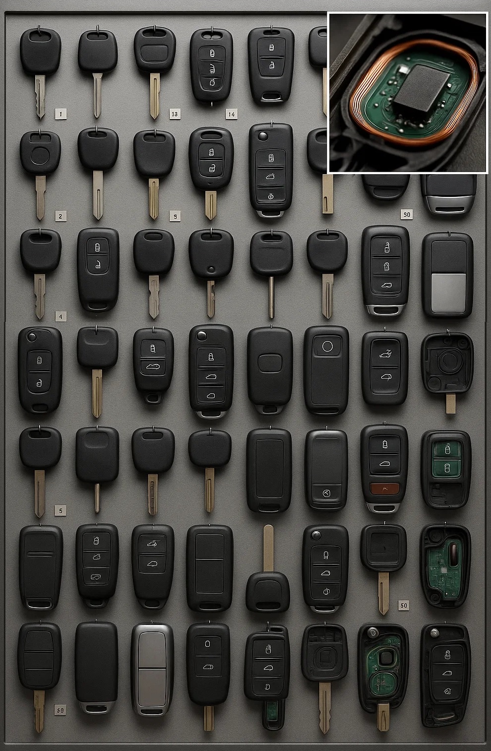• تجهیزات مدرن: استفاده از دستگاه‌های دیاگ و کات‌کلی حرفه‌ای برای تعریف ریموت و کلید خودروهای جدید و لوکس. توانایی ساخت ریموت کیلس (Keyless Go) و ریموت‌ خودروهای هوشمند در محل.