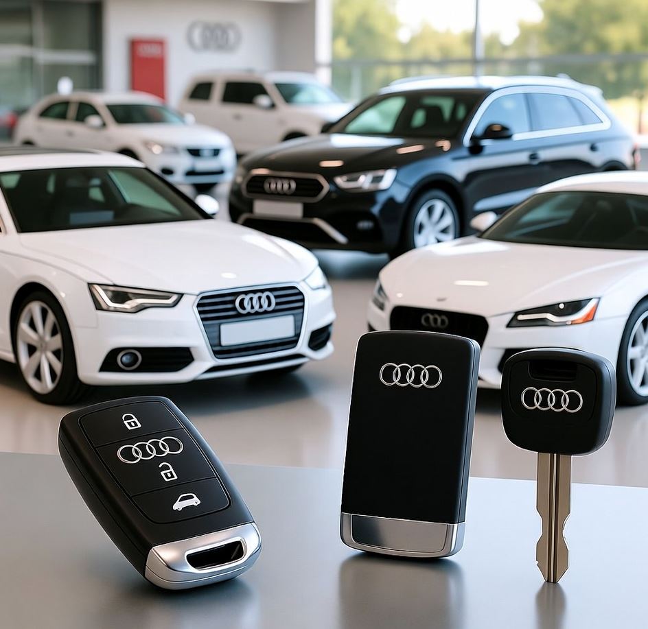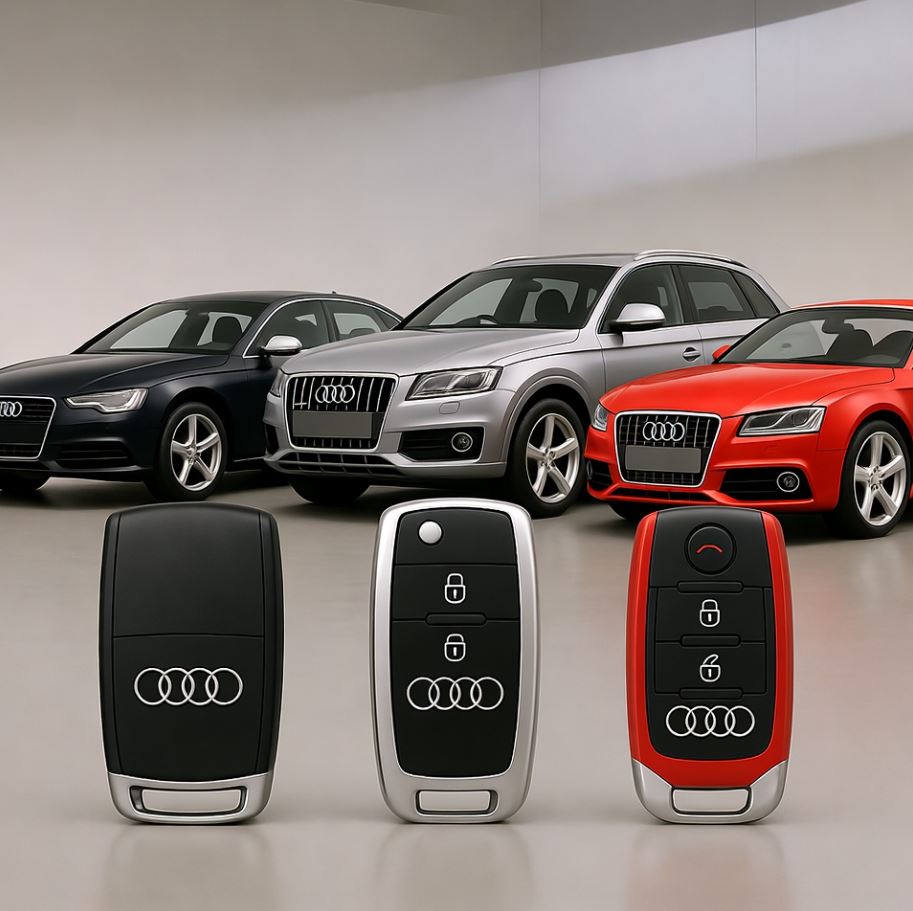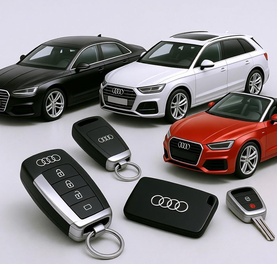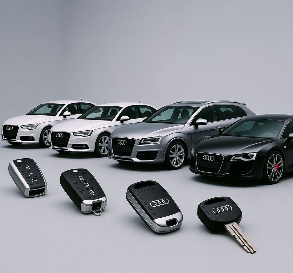 ساخت انواع ریموت و سوئیچ کیلس: ساخت و برنامهریزی ریموت و کلید Keyless برای تمام مدلهای آئودی (سدانهای سری A مانند A4، A6، A8 و شاسیبلندهای Q3، Q5، Q7، SUVهای گرانقیمت و سری اسپرت S/RS).